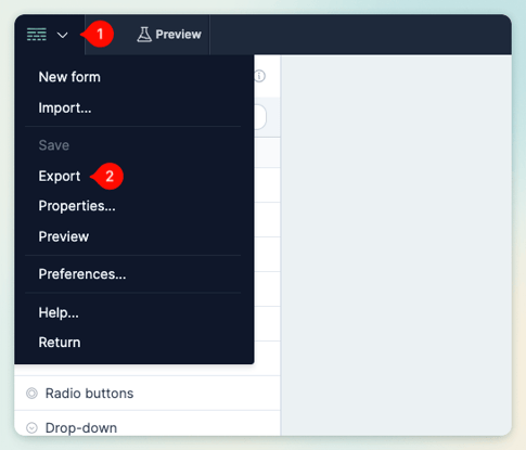 In the form builder, click the menu in the top left corner and select "Export." This will download a file that you can forward to your colleagues via a communication channel. They can then follow the steps above to import this file.