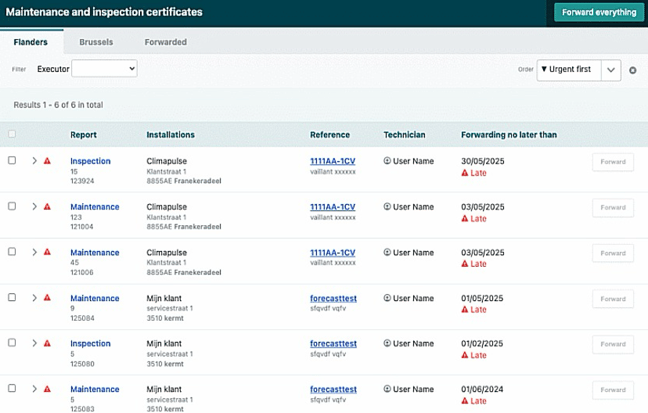 You can find your maintenance and inspection certificates under Reports in the left menu. When you open this section, you will see a tab for Flanders at the top and next to it there is a separate tab for forwarded certificates.