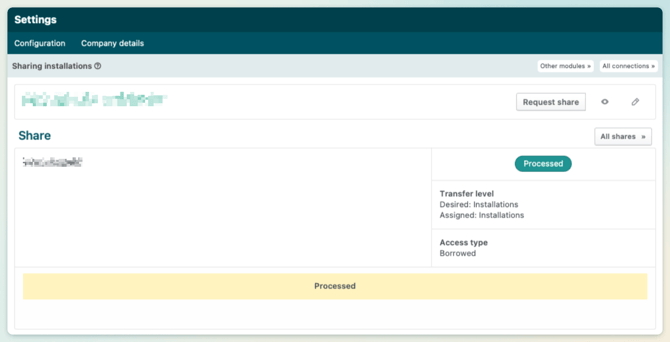 With an active connection, you can now share specific data via shares. A share determines which set of information is transferred and makes it possible to precisely control access to this data. This can be done at three levels: customer, location or installation.
