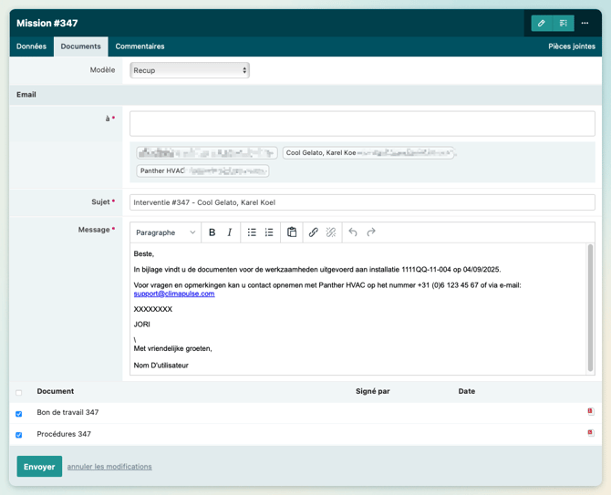 Afin d’éviter de répéter sans cesse la même chose, Climapulse complétera les données de l’installation elle-même dans des documents tels que les bons de travail lorsque cela sera utile et possible. Elle utilise la dernière version des données d’installation au moment où la mission est marquée comme Exécutée. Si vous souhaitez inclure une version différente des données d’installation dans les documents d’une mission, vous pouvez le modifier sous l’onglet Documents.