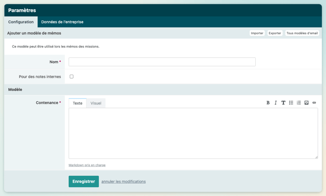 Cliquez sur Ajouter pour configurer immédiatement votre premier modèle. Ce lien vous permet ensuite de consulter, modifier et supprimer la liste de tous les modèles.