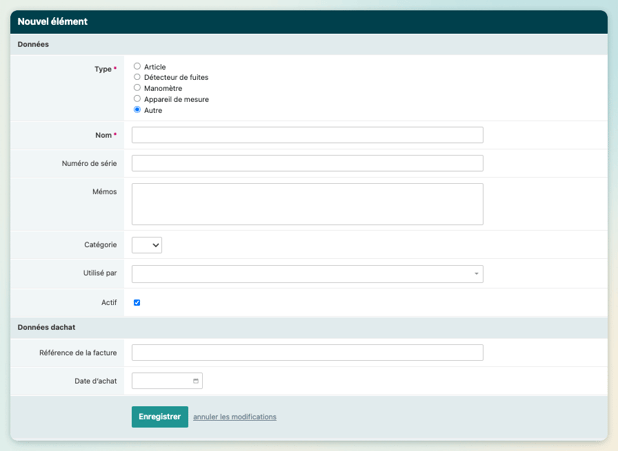 Renseignez les informations : type, nom, numéro de série, notes et éventuellement une catégorie.