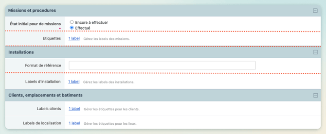 Vous pouvez les trouver auprès des sections correspondantes sur la page de configuration. Un label/une étiquette ne peut être appliqué(e) qu’à un client, une mission ou une installation.