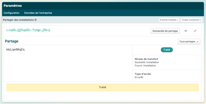 Avec une connexion active, vous pouvez désormais partager des données spécifiques via des partages. Un partage définit l'ensemble des informations transférées et vous permet de contrôler précisément l'accès à ces données. Cela peut se faire à trois niveaux : client, emplacement ou installation.