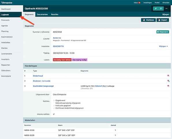 Indien de opdracht reeds is uitgevoerd kan die ook achteraf nog ondertekend en verzonden worden. Zoek de opdracht via het logboek in de linker menubalk van je Climapulse account of ga naar het tabblad werkzaamheden van de installatie. Zodra je de desbetreffende werkbon gevonden klik je op het oogje om de detailgegevens te bekijken.