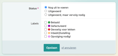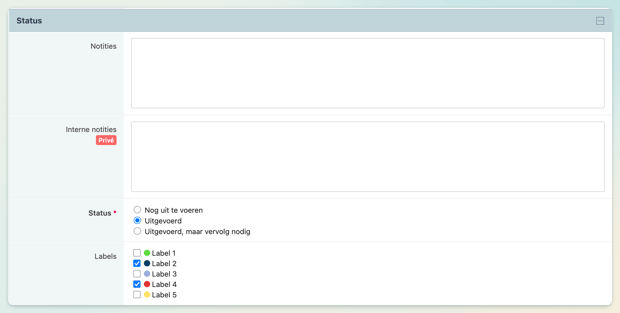 Tot slot kun je op de werkbon nog notities toevoegen. Je kunt kiezen tussen notities die zichtbaar zijn voor de klant en interne notities die enkel voor jezelf of je collega’s bedoeld zijn. Je kunt ook labels toevoegen om de werkbon beter te organiseren.