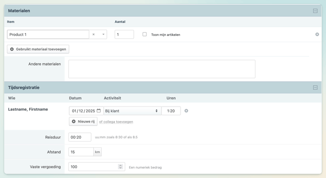 Afhankelijk van hoe je account is ingesteld, kun je daarnaast ook je werktijd registreren: bij de klant op locatie, in het atelier of op een andere werkplek. Indien nodig kun je ook reistijd, afgelegde afstand en een vaste vergoeding toevoegen. Daarnaast kun je de naam van je collega toevoegen aan de werkbon wanneer jullie samen aan een opdracht hebben gewerkt.