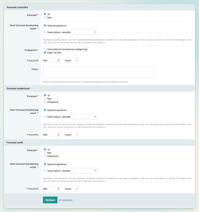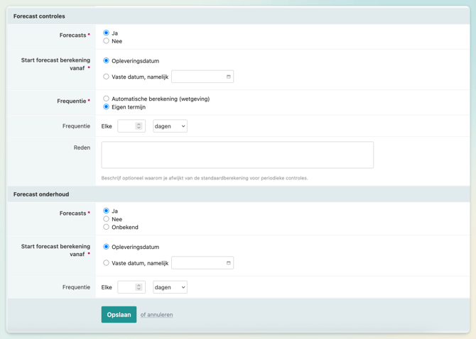 Je kunt er ook voor kiezen om onderhouden in de Forecast op te nemen. Ook hier heb je de mogelijkheid om de termijn automatisch volgens de wetgeving te laten berekenen, een eigen termijn te kiezen of de Forecast voor onderhouden uit te schakelen.