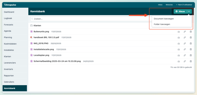 Alle documenten die je als nieuwe bijlage toevoegt binnen Climapulse worden toegevoegd in de Kennisbank. Je kan ook bestanden toevoegen aan de kennisbank zonder dat deze gekoppeld zijn aan een item. Om een nieuw document toe te voegen klik je rechtsboven op Nieuw > Document toevoegen.