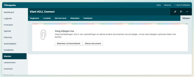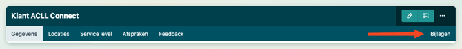 je kan bijlagen toevoegen aan klanten, locaties, installaties en opdrachten. Dit doe je door rechtsboven op Bijlagen te klikken.