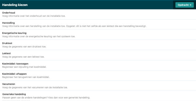 Deze handelingen bepalen wat er moet gebeuren. Alle andere handelingen, inclusief het type “Herstelling” zijn, wat de applicatie betreft, louter informatief. De echte herstelling van een lek kan bijvoorbeeld louter aangetoond worden door een lektest uit te voeren.