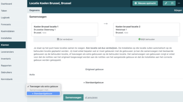 Bij elke locatie vind je een overzicht terug van de gebouwen en de installaties binnen elk gebouw. Daarbij krijg je ook meteen de nodige informatie zoals referentie, modelgegevens en eigenschappen, aangevuld met de datum van je laatste opdracht voor die installatie.