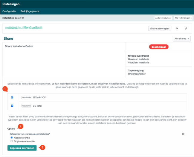 Met een actieve verbinding kun je nu via shares specifieke gegevens delen. Een share bepaalt welke set informatie wordt overgedragen en maakt het mogelijk om de toegang tot deze gegevens nauwkeurig te regelen. Dit kan op drie niveaus: klant, locatie of installatie.