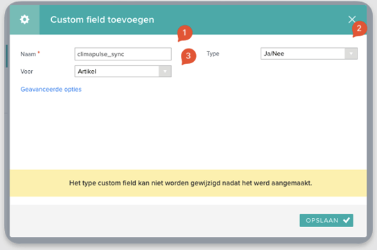 Hier maak je een aangepast veld aan dat zichtbaar is bij al je producten. Dit veld moet van het type ja/nee zijn en kan per product worden in- of uitgeschakeld. Het veld moet exact de volgende naam krijgen, volledig in kleine letters: climapulse_sync