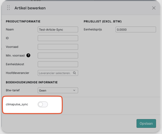 Wil je dit artikel synchroniseren met Climapulse Service, zet het veld dan op actief door op de knop te klikken. Zodra het veld actief is, kleurt het groen.